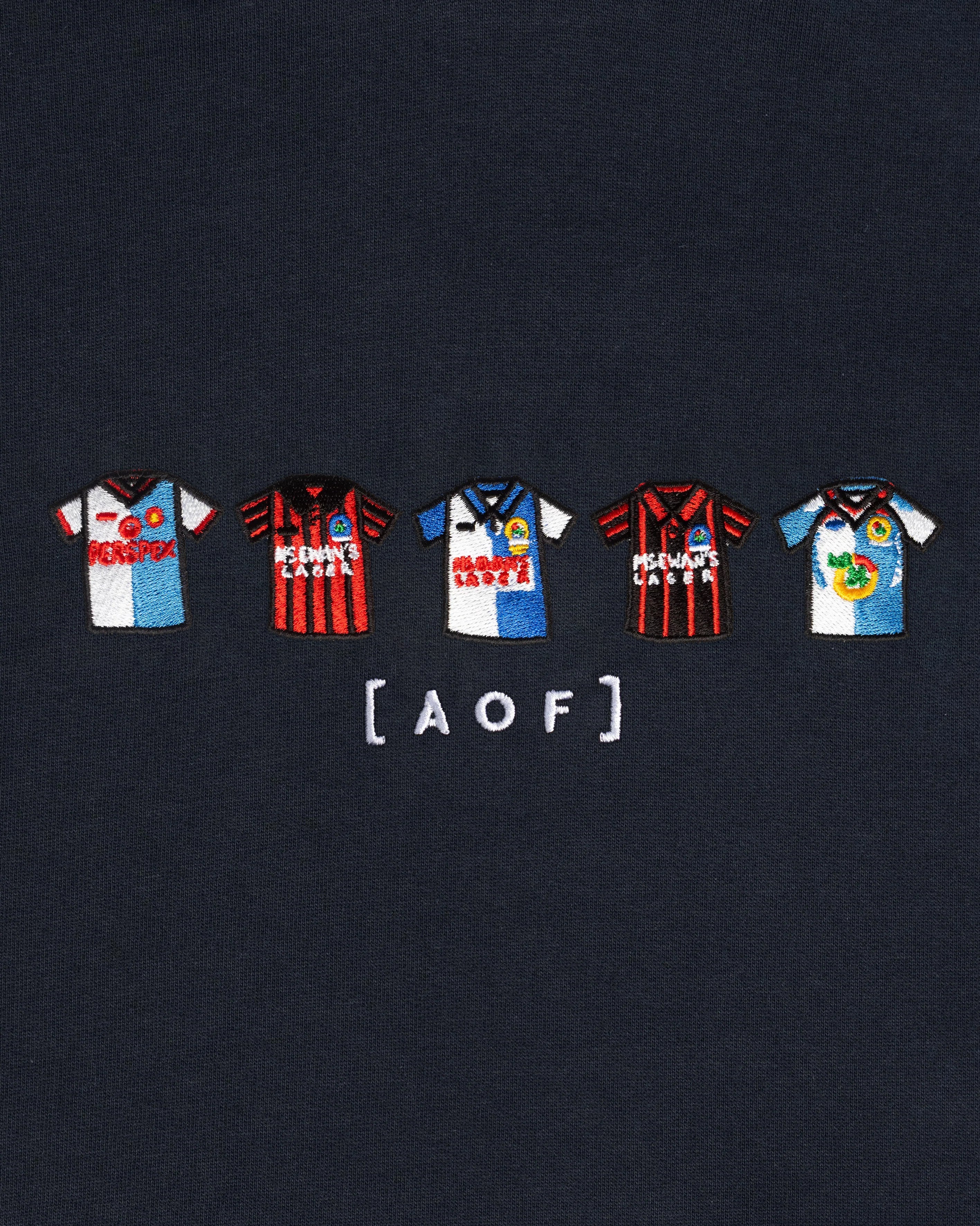 Graphic Design: A collection of classic football shirts. The fabric of football history. Over 25,000 stitches, 30 minutes of embroidery.